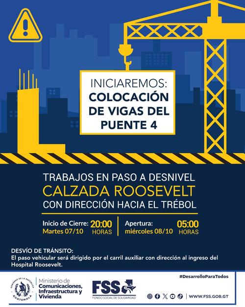 Todo parece ir de maravilla desde que se reanudó la construcción de este paso a desnivel que será de mucha ayuda para las personas que transitan por esta vía tan importante para la Ciudad de Guatemala, por tal motivo el Fondo Social de Solidaridad (FSS) informó que este martes 7 de octubre se realizará un cierre temporal en la calzada Roosevelt, zona 11 capitalina.
